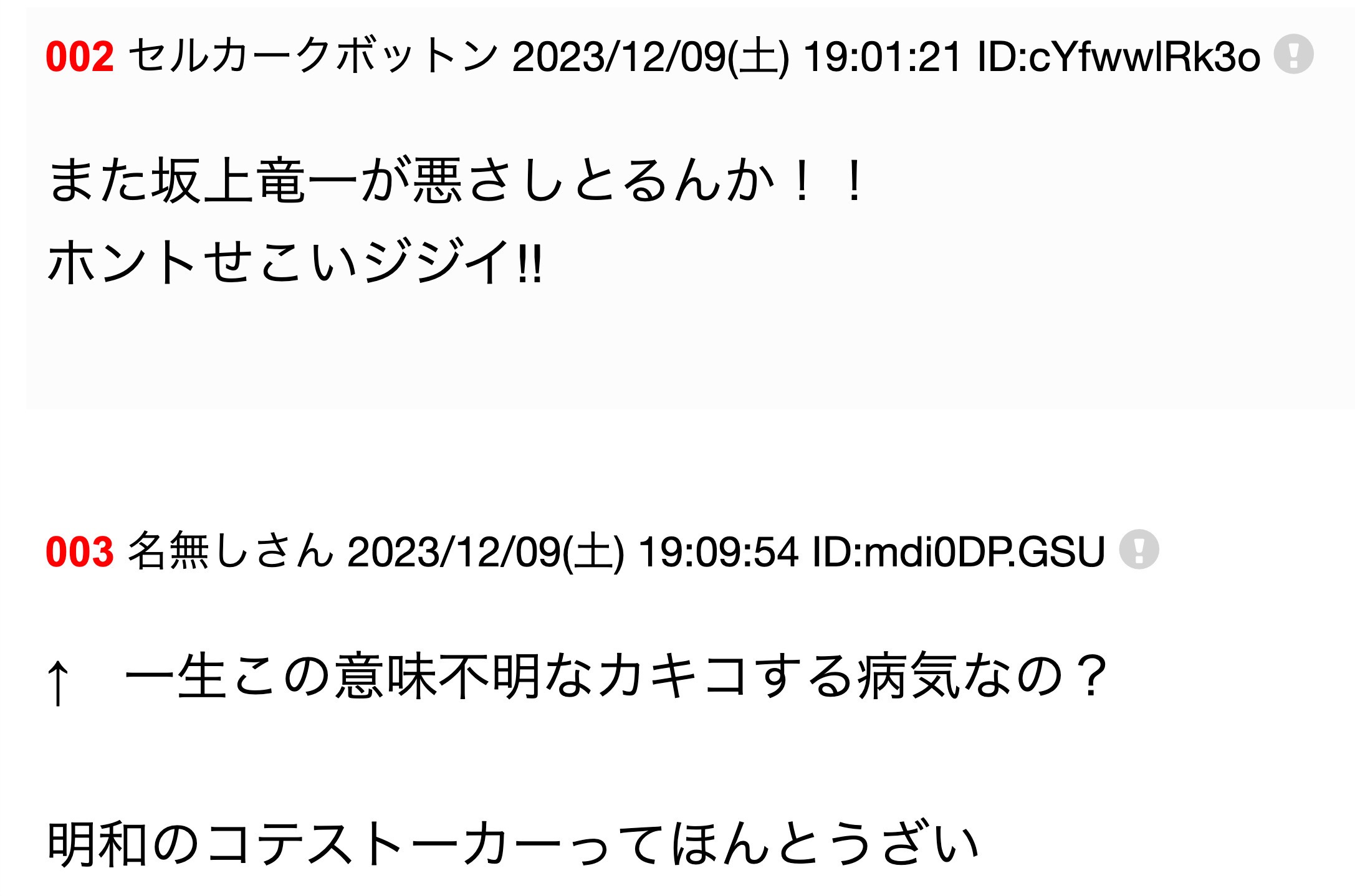 | 006 | 名無しさん | 2026/01/20(火) 18:25:48 | また坂上竜一が悪さしとるんか!! おま | 画像なし |