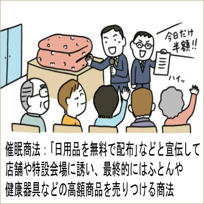 集団催眠状態にして売りつけることから、催眠商法といわれます。