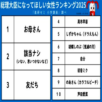 小学生が選ぶ「総理大臣になってほしい女性」ランキングを公開した。