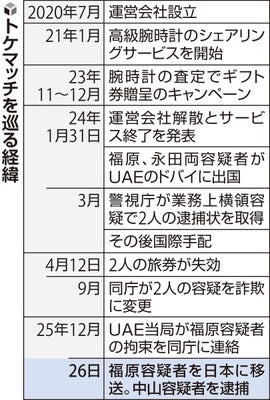 高級腕時計シェアリングサービス「トケマッチ」をめぐる事件で、指名手配され、ドバイに逃亡していた運営会社