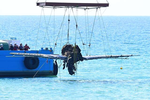 時中断した。午後2時半ごろに再開し、約12メートルの両翼が海面に現れた。