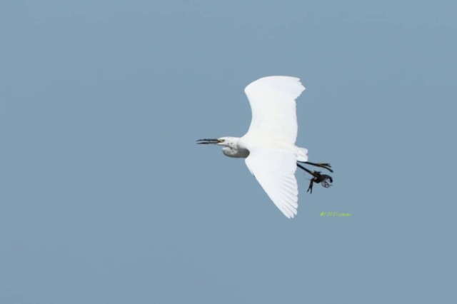 「なんか飛んできたと思ったらコサギがアメリカザリガニに脚挟まれてて草」とコメントしました。