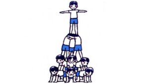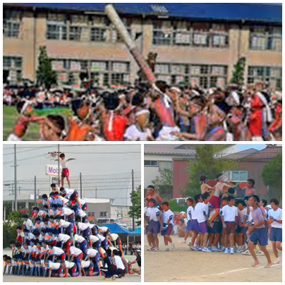 組体操では、巨大なピラミッドやタワーを作り、成功すれば歓声が沸き起こるものの、