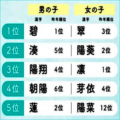 初めての1位となった。男の子の名前では、「朝陽(あさひ)」が昨年6位から
