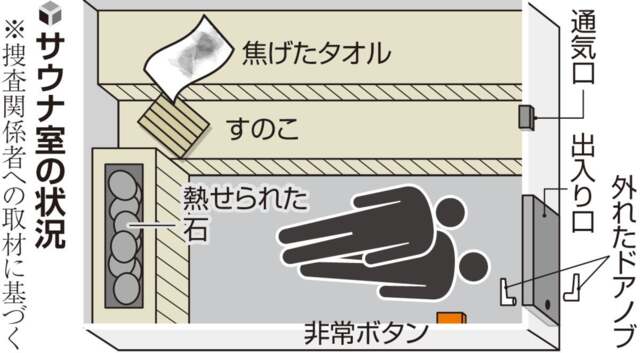 同庁幹部によると、現場のサウナ室のドアノブはL字形の木製で、内側、外側ともに外れていた。ドアノブと連動する「ラッチボルト」が動かず、ドアが開かない状態になっていた。同庁は夫婦の入室後に壊れたとみて関連を調べている。