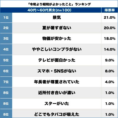 40~60代の男女100人に「令和より昭和がよかったこと」について聞いてみた。