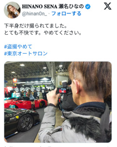 瀬名は「下半身だけ撮られてました。とても不快です。やめてください」と投稿。「#盗撮やめて」「#東京オートサロン」のハッシュタグを添え、