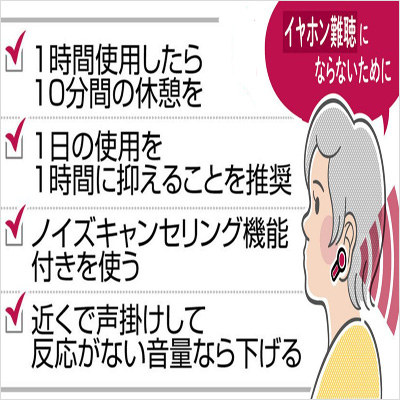 予防には、ヘッドホンやイヤホンを大きな音で長時間、使わないことが