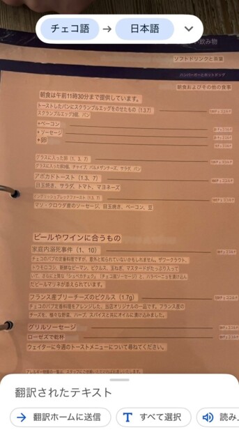 チェコ語のメニューを翻訳アプリでのぞくと、画面に「家庭内溺死事件」という物騒な料理名が表示されました。チェコ