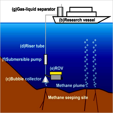メタンプルーム湧出地点に気泡捕集器、揚収管、水中ポンプ、